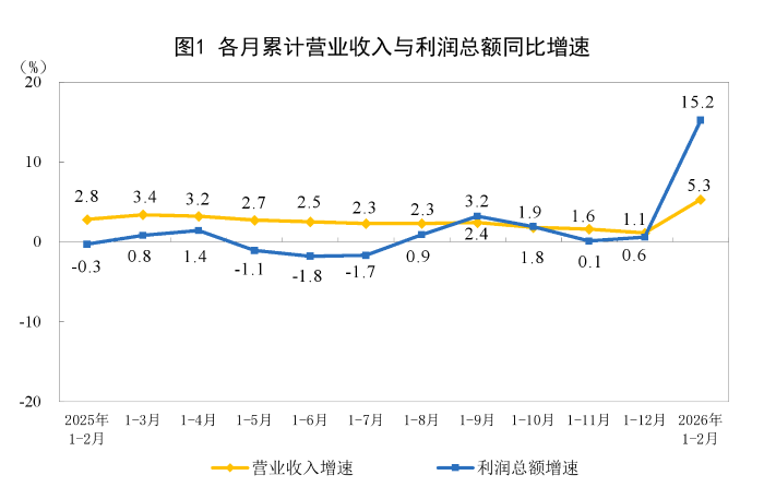1—2月份,全国规模以上工业企业实现利润总额10245.6亿元,同比增长15.2%(按可比口径计算,详见附注二)。