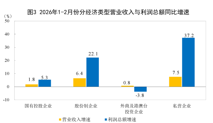 1—2月份,规模以上工业企业中,国有控股企业实现利润总额3665.6亿元,同比增长5.3%;股份制企业实现利润总额8032.9亿元,增长22.1%;外商及港澳台投资企业实现利润总额2167.5亿元,下降3.8%;私营企业实现利润总额2844.5亿元,增长37.2%。